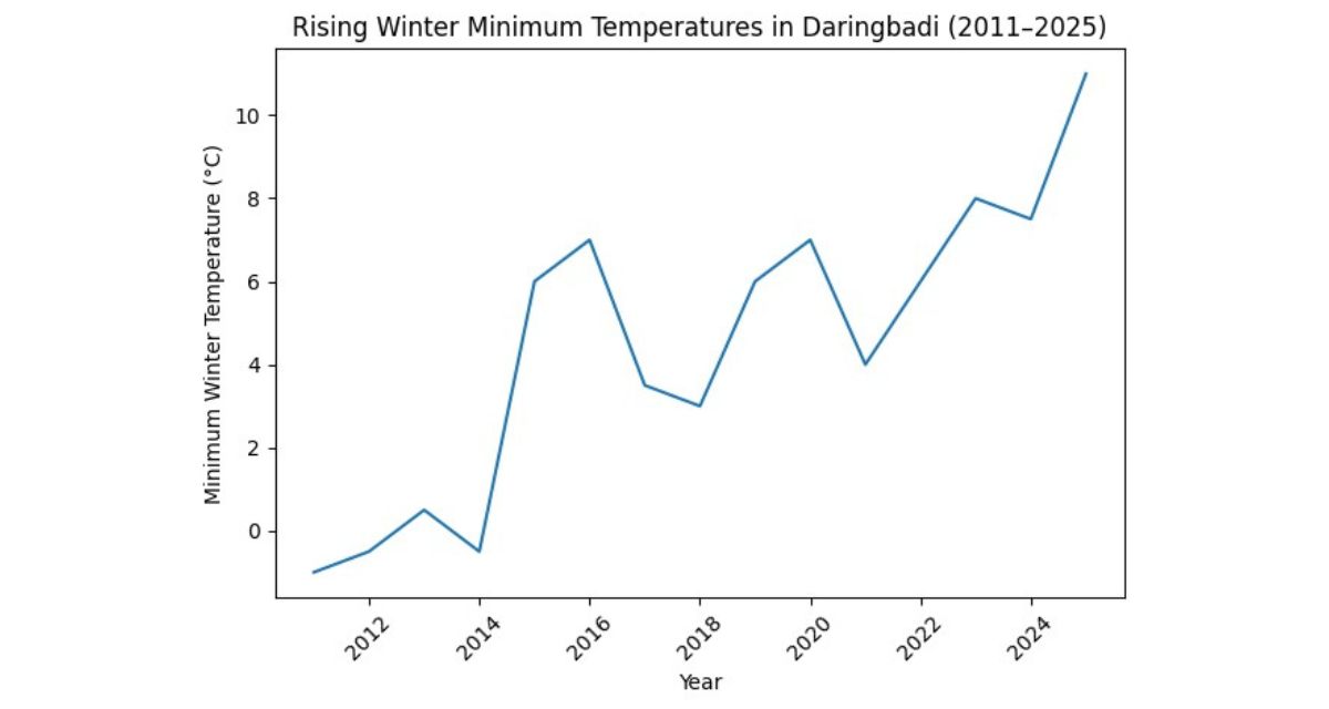 The data confirms what residents feel. Temperature records from 2011 to 2025 show a steady rise in winter minimum temperatures across Daringbadi, from minus 1°C, with snowfall and cold waves, to 11°C. Snowfall, once a defining feature of the region, has become rare.