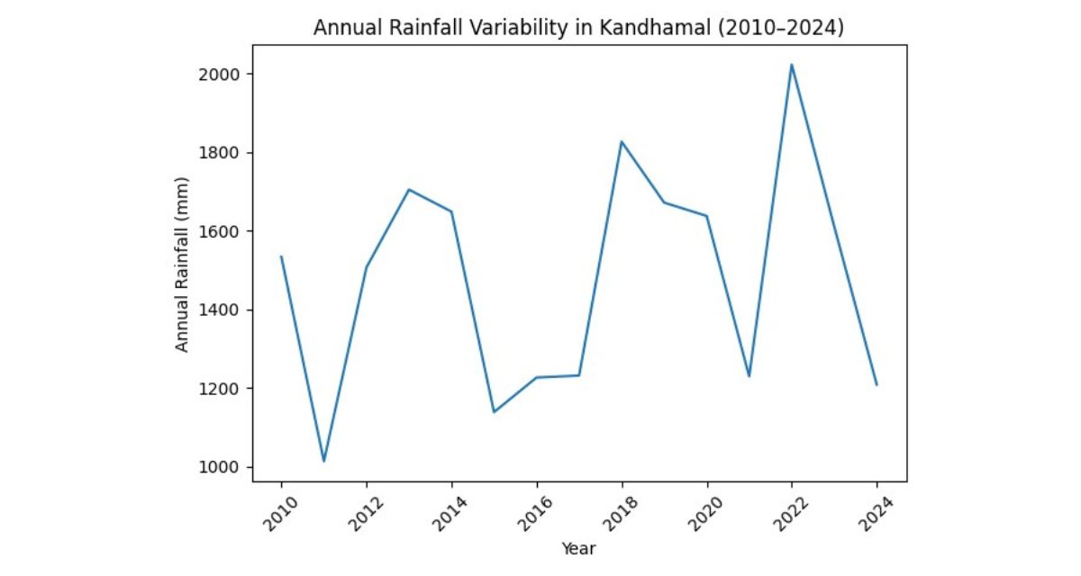 The rainfall patterns have also shifted and are not just declining; they are also becoming erratic. Annual totals in Kandhamal swung from 1,013 mm in 2011 to 1,826 mm in 2018, before dropping again to 1,208 mm in 2024, well below the district average of 1,620 mm. Rain now arrives in bursts, absent when needed, destructive when it does come.