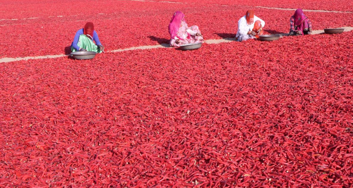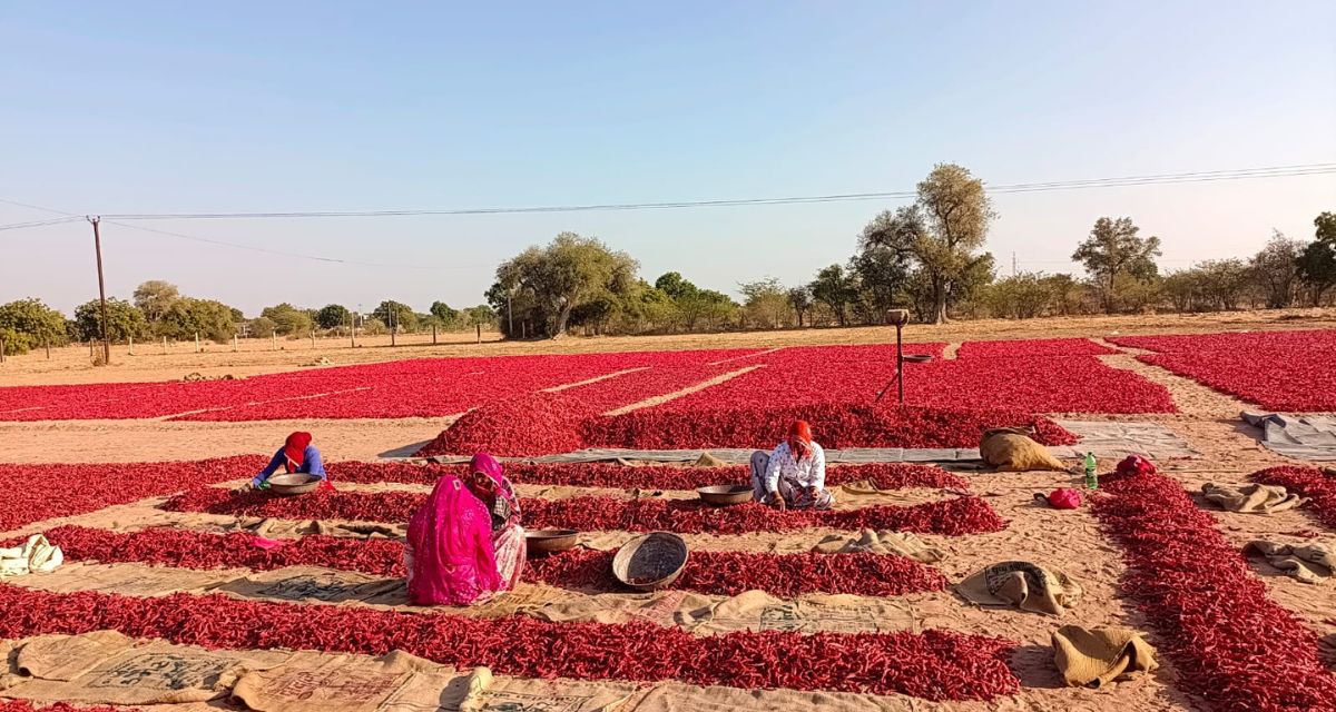 Cover photo - Women taking care of dried red chilies in a field in Bada Kotecha village in the Mathania-Tinwari agricultural area of Jodhpur district (Photo - Jethmal Jain)